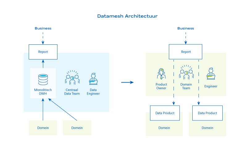 Domeinteams zijn verantwoordelijk voor hun eigen data. Ze leveren die data als een “dataproduct” op. Dit betekent dat ze zorgen voor duidelijke definities, goede kwaliteit en gebruikscontext.