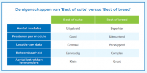 Een belangrijke vraag hierin: is het proces waarvoor je software zoekt onderscheidend ten opzichte van de concurrent? Is dit het geval, dan wil je dat wellicht stutten met de best mogelijke software. Oftewel, een ‘Best of breed’-applicatie. Is dat echter niet zo, dan kun je je afvragen of het beheersen van je software landschap en de voordelen die ‘Best of suite’ met zich meebrengen zwaarder wegen dan de voordelen van ‘Best of breed’. Uiteraard is het ook mogelijk om een hybride oplossing te kiezen. Een stevige backbone met een ‘Best of suite’-applicatie, aangevuld met één of meerdere ‘Best of breed’-oplossingen.