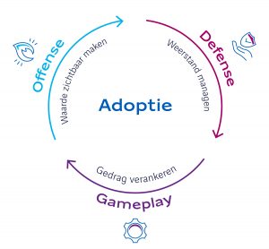 Het geheim zit in adoptie: het gaat niet om techniek, tools of regels, maar om gedrag. Zie adoptie als een spel dat op drie niveaus gespeeld wordt: offense, gameplay en defense.