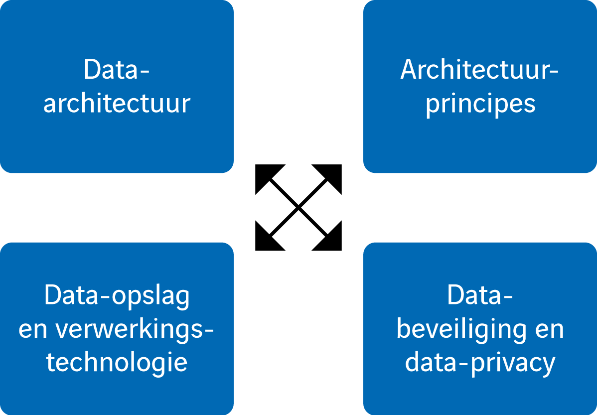 De vierde invalshoek is het definiëren van algemene architectuurprincipes. Denk hierbij aan principes voor hoe en waar data opgeschoond wordt, hoe en waar datahistorie opgeslagen wordt, waar regels voor data-privacy geïmplementeerd worden en hoe data-eigenaarschap wordt toegekend.