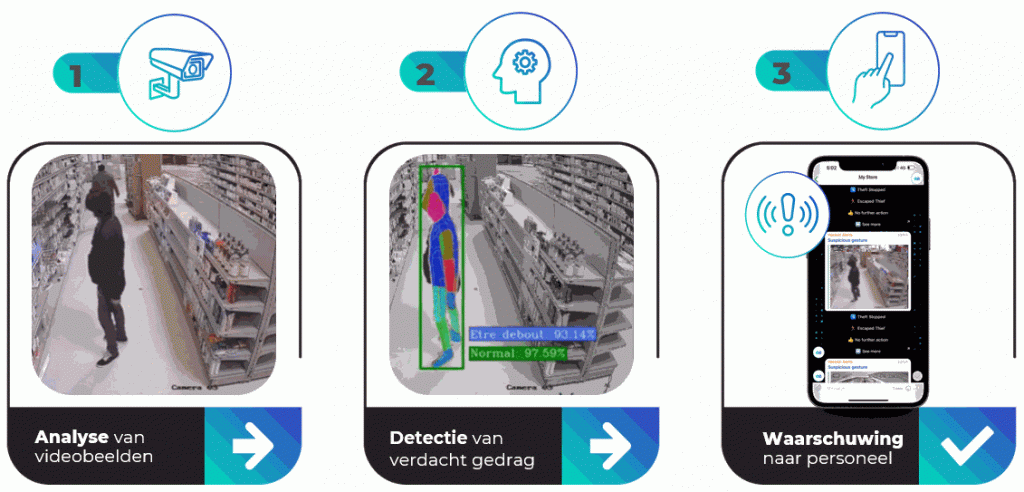 - Veesion automatiseert de registratie van verdachte activiteiten door realtime de beelden van bestaande CCTV camerasystemen te analyseren.