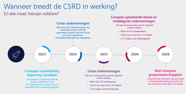 De CSRD wordt gefaseerd ingevoerd vanaf januari 2024. Grote bedrijven die momenteel onder de NFRD vallen moeten in 2024 beginnen met rapporteren. Andere grote ondernemingen volgen in 2025, met kleine en middelgrote ondernemingen die vanaf 2026 moeten rapporteren. Niet-EU ondernemingen hebben tot 2028 de tijd om te voldoen aan de richtlijn.