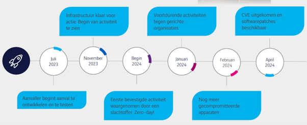 Hoe dit er in de praktijk aan toe gaat werd kraakhelder toegelicht. Als voorbeeld werd een kwetsbaarheid in Cisco ASA-systemen genomen. Deze kwetsbaarheid werd in eerste instantie ontdekt door security-experts die afwijkend gedrag in netwerken observeerden. Vanaf het moment dat het voor het eerst geconstateerd werd (Zero-Day) tot de geboden oplossing via CVE (Common Vulnerabilities and Exposures) ID’s, werden er gedurende meerdere maanden diverse organisaties getroffen. De volledige timeline is onderstaand te zien:
