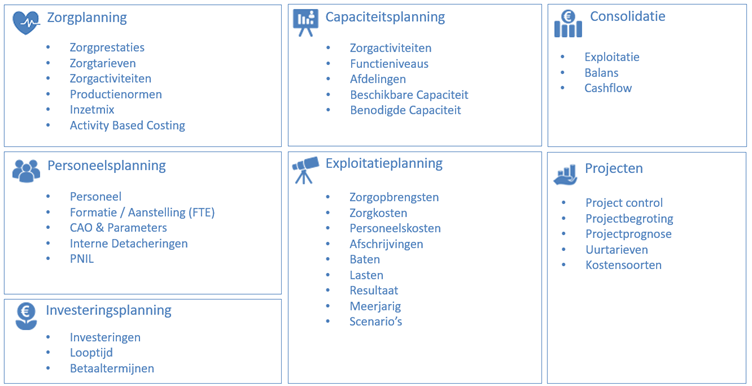Het resultaat is een planningsproces waarin het opstellen van de begroting, prognoses of een rolling forecast transparant is met uniformiteit in berekeningen door de centrale vastlegging. Integratie op strategische, tactische en operationele plannen op verschillende locaties wordt mogelijk. Daarnaast wordt niet alleen terug gekeken, maar ook vooral vooruit. Het brengt inzicht in de verwachte zorgopbrengsten, personele ontwikkelingen en resultaatontwikkelingen binnen de locaties met de mogelijkheid om tijdig bij te sturen. Bijvoorbeeld in uw functiemix, capaciteit, kosten of investeringen. Heldere KPI’s en dashboards helpen hierbij.