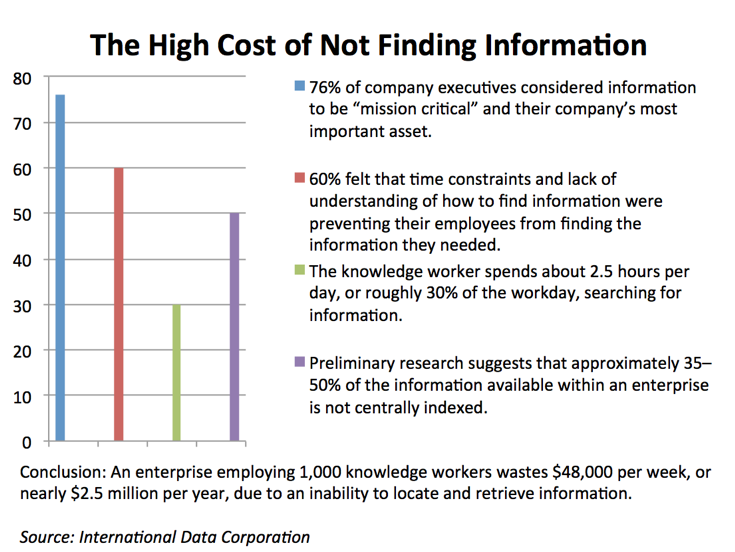 Uit een onderzoek van IDC, dat door de jaren heen regelmatig is geciteerd, bleek dat werknemers binnen een organisatie 30 procent van hun dagelijkse werktijd kwijt zijn met het zoeken naar correcte en bruikbare informatie voor hun dagelijkse werkzaamheden. Volgens het onderzoek kwam dit door het gebrek aan centraal geïndexeerde informatie en wisten medewerkers vaak niet hoe ze toegang konden krijgen tot die informatie. Nu, jaren later zijn de resultaten van dit onderzoek nog steeds actueel. Ondanks de forse investeringen die bedrijven hebben gedaan in technologie om data te verzamelen, te integreren en beschikbaar te stellen aan gebruikers. Die gebruiker ziet zich geconfronteerd met een scala aan databronnen – data warehouses, data marts, data lakes, on-premise systemen (ERP, financieel, logistiek), cloud systemen, social media en andere big databronnen – en kan ‘door de data de informatie niet meer zien’. En dat kost organisaties veel geld…